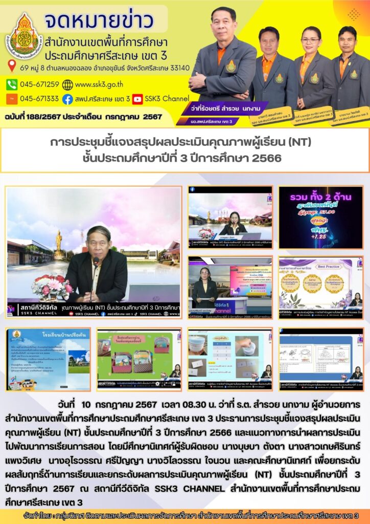 การประชุมชี้แจงสรุปผลประเมินคุณภาพผู้เรียน (NT) ชั้นประถมศึกษาปีที่ 3 ปีการศึกษา 2566 กรกฎาคม 13, 2024 Last updated : กรกฎาคม 13, 2024 wilailak chaiyamas