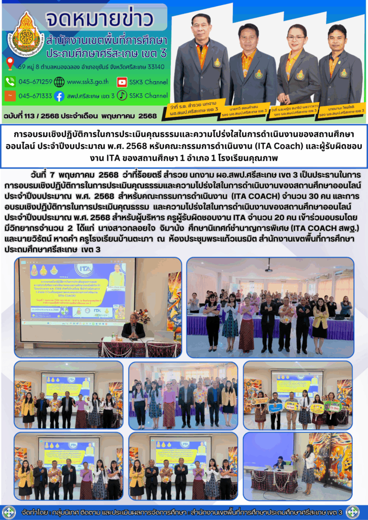 การอบรมเชิงปฏิบัติการในการประเมินคุณธรรมและความโปร่งใสในการดำเนินงานของสถานศึกษาออนไลน์ ประจำปีงบประมาณ พ.ศ. 2568 หรับคณะกรรมการดำเนินงาน (ITA Coach) และผู้รับผิดชอบงาน ITA ของสถานศึกษา 1 อำเภอ 1 โรงเรียนคุณภาพ พฤษภาคม 8, 2025 Last updated : พฤษภาคม 8, 2025 Phakjerawan wayophat