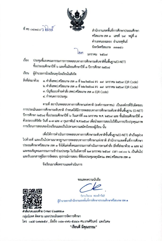 ขอเชิญประชุมชี้แจงคณะกรรมการโครงการทดสอบการศึกษา O-NET ระดับชั้น ป.6 และ ม.3 มกราคม 26, 2026 Last updated : มกราคม 26, 2026 Phakjerawan wayophat