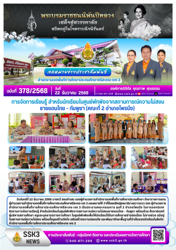 การจัดการเรียนรู้ สำหรับนักเรียนในศูนย์พักพิงจากสถานการณ์ความไม่สงบชายแดนไทย – กัมพูชา (คณะที่ 2 อำเภอไพรบึง) ธันวาคม 22, 2025 Last updated : ธันวาคม 22, 2025 Phakjerawan wayophat