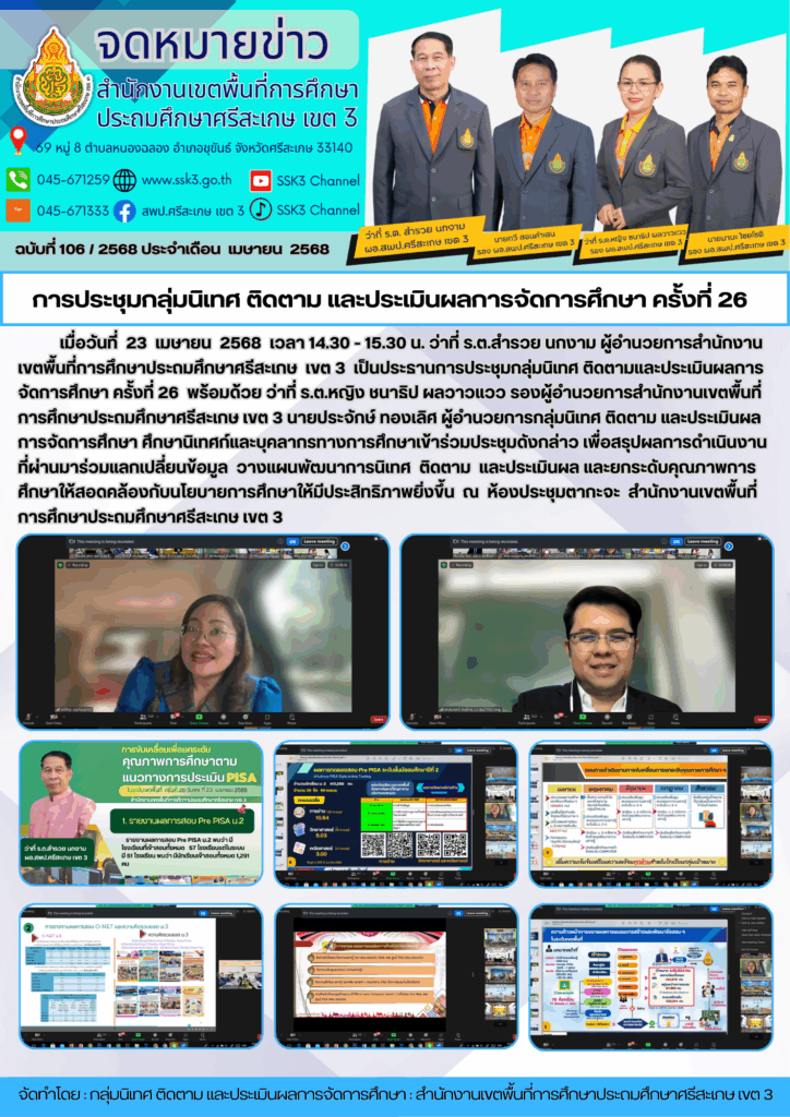 การประชุมกลุ่มนิเทศ ติดตาม และประเมินผลการจัดการศึกษา ครั้งที่ 26วันที่ 23 เมษายน 2568 เวลา 14.30. -15.30น. ว่าที่ ร.ต.สำรวย นกงาม ผู้อำนวยการสำนักงานเขตพื้นที่การศึกษาประถมศึกษาศรีสะเกษ เขต 3 เป็นประธานการประชุม เมษายน 25, 2025 Last updated : เมษายน 25, 2025 wilailak chaiyamas