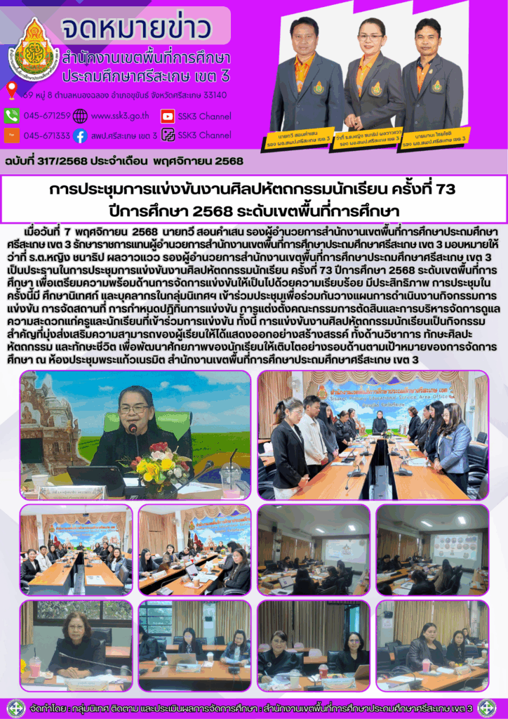 การประชุมการแข่งขันงานศิลปหัตถกรรมนักเรียน ครั้งที่ 73 ปีการศึกษา 2568 ระดับเขตพื้นที่การศึกษา พฤศจิกายน 10, 2025 Last updated : พฤศจิกายน 10, 2025 Phakjerawan wayophat
