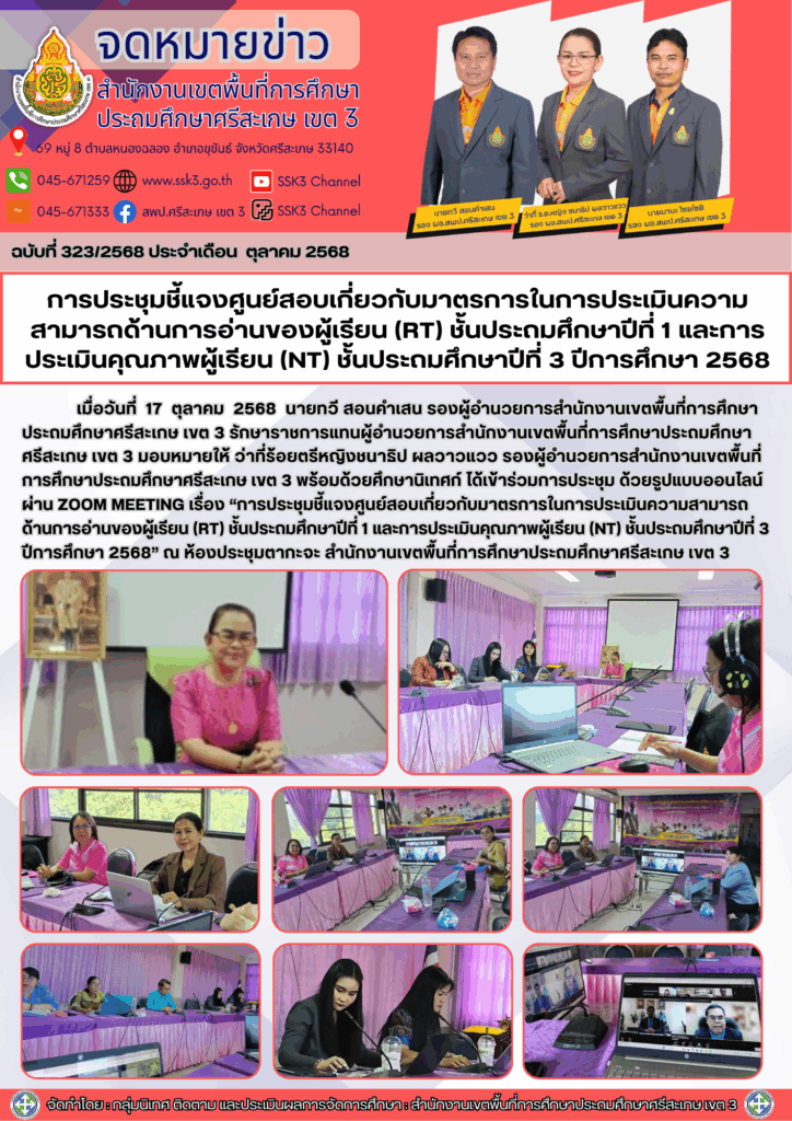 การประชุมชี้แจงศูนย์สอบเกี่ยวกับมาตรการในการประเมินความสามารถด้านการอ่านของผู้เรียน (RT) ชั้นประถมศึกษาปีที่ 1 และการประเมินคุณภาพผู้เรียน (NT) ชั้นประถมศึกษาปีที่ 3 ปีการศึกษา 2568 พฤศจิกายน 10, 2025 Last updated : พฤศจิกายน 10, 2025 Phakjerawan wayophat