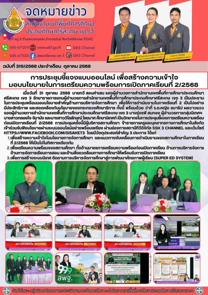 การประชุมชี้แจงแบบออนไลน์ เพื่อสร้างความเข้าใจมอบนโยบายในการเตรียมความพร้อมการเปิดภาคเรียนที่ 2/2568 พฤศจิกายน 4, 2025 Last updated : พฤศจิกายน 4, 2025 Phakjerawan wayophat