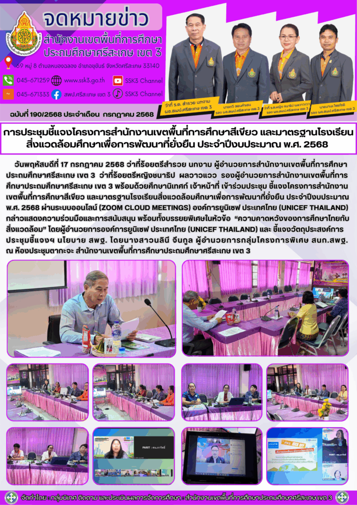 การประชุมชี้แจงโครงการสำนักงานเขตพื้นที่การศึกษาสีเขียว และมาตรฐานโรงเรียนสิ่งแวดล้อมศึกษาเพื่อการพัฒนาที่ยั่งยืน ประจำปีงบประมาณ พ.ศ. 2568 กรกฎาคม 18, 2025 Last updated : กรกฎาคม 18, 2025 Phakjerawan wayophat