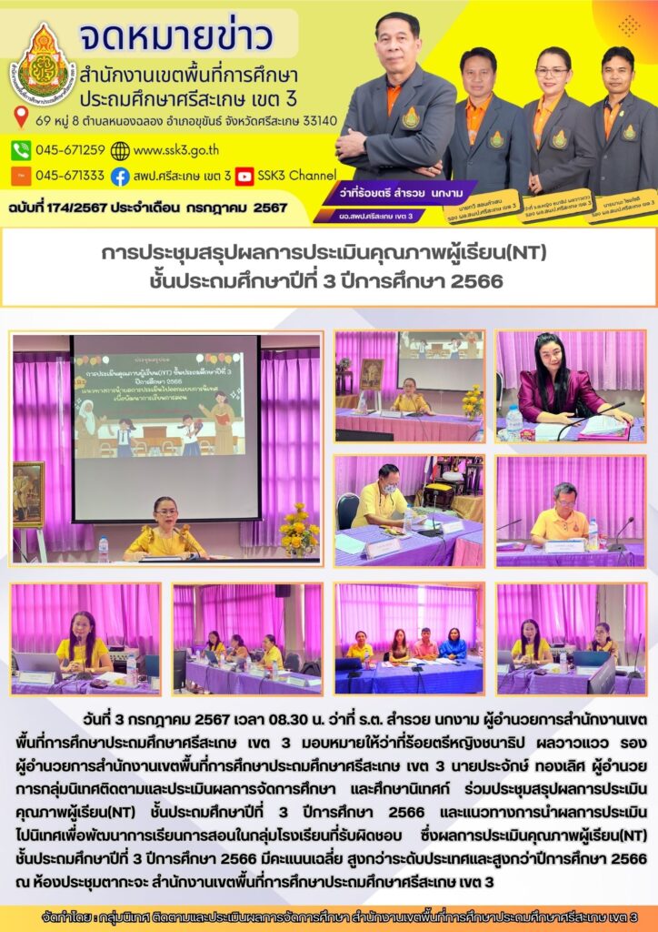 การประชุมสรุปผลการประเมินคุณภาพผู้เรียน (NT) ชั้นประถมศึกษาปีที่ 3 ปีการศึกษา 2566 ณ ห้องประชุมตากะจะ สำนักงานเขตพื้นที่การศึกษาประถมศึกษาศรีสะเกษ เขต 3 กรกฎาคม 4, 2024 Last updated : กรกฎาคม 4, 2024 wilailak chaiyamas