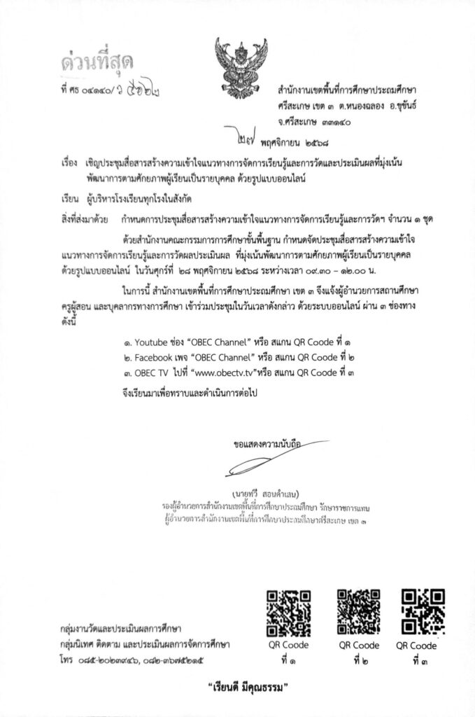 การประชุมสื่อสารสร้างความเข้าใจแนวทางการจัดการเรียนรู้และการวัดและประเมินผลที่มุ่งเน้น พัฒนาการตามศักยภาพผู้เรียนเป็นรายบุคคล ด้วยรูปแบบออนไลน์