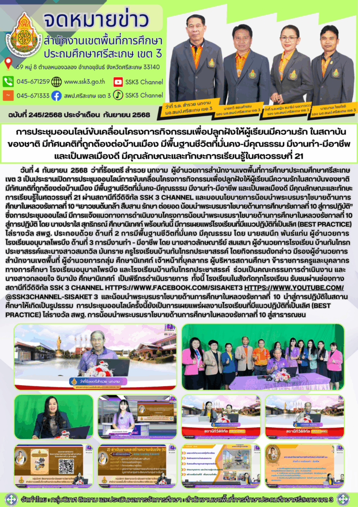 การประชุมออนไลน์ขับเคลื่อนโครงการกิจกรรมเพื่อปลูกฝังให้ผู้เรียนมีความรัก ในสถาบันของชาติ มีทัศนคติที่ถูกต้องต่อบ้านเมือง มีพื้นฐานชีวิตที่มั่นคง-มีคุณธรรม มีงานทำ-มีอาชีพ และเป็นพลเมืองดี มีคุณลักษณะและทักษะการเรียนรู้ในศตวรรษที่ 21 กันยายน 5, 2025 Last updated : กันยายน 5, 2025 Phakjerawan wayophat
