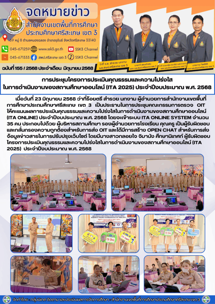การประชุมโครงการประเมินคุณธรรมและความโปร่งใสในการดำเนินงานของสถานศึกษาออนไลน์ (ITA 2025) ประจำปีงบประมาณ พ.ศ. 2568 มิถุนายน 26, 2025 Last updated : กรกฎาคม 15, 2025 Phakjerawan wayophat