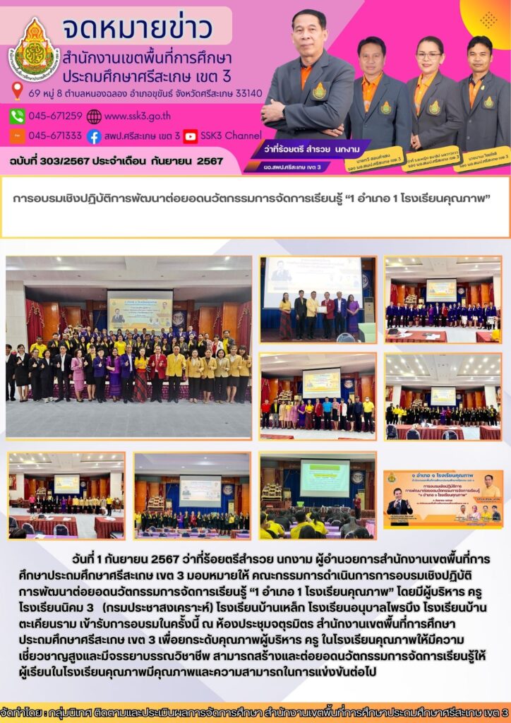 การอบรมเชิงปฏิบัติการต่อยอดนวัตกรรมการจัดการเรียนรู้ "1 อำเภอ 1 โรงเรียนคุณภาพ" กันยายน 17, 2024 Last updated : กันยายน 17, 2024 wilailak chaiyamas