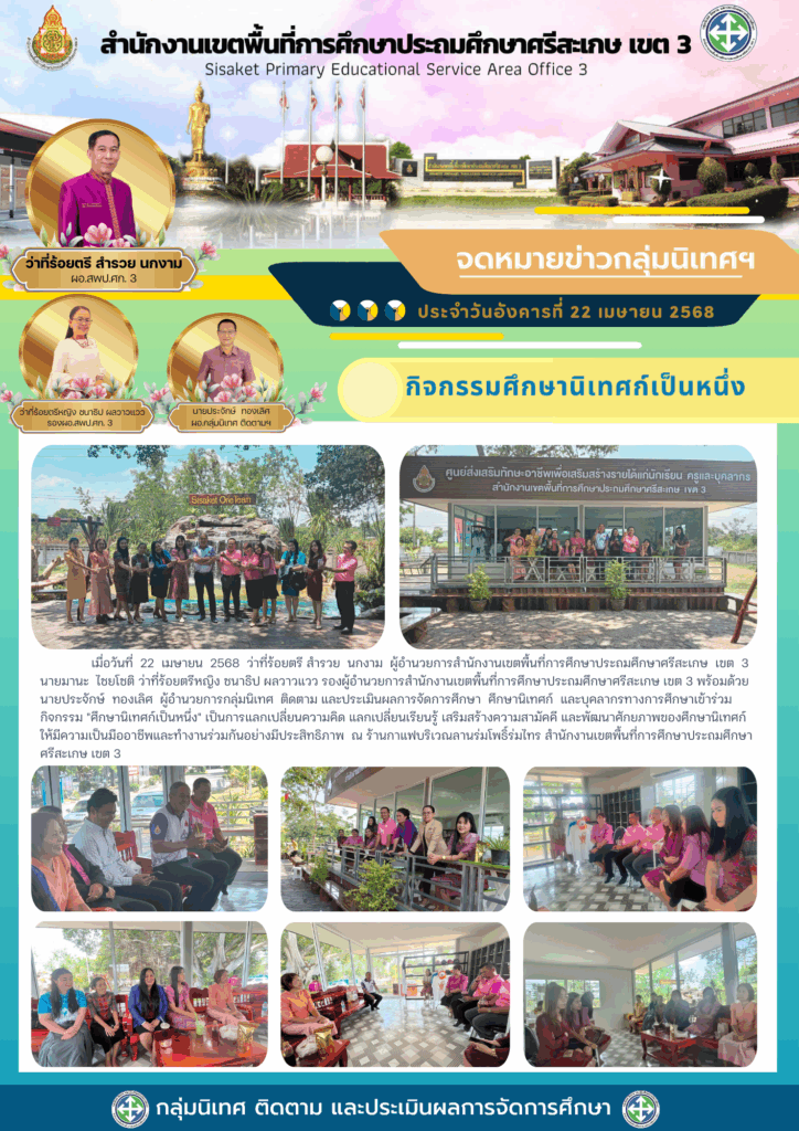 เมื่อวันที่ 22 เมษายน 2568 ว่าที่ร้อยตรี สำรวย นกงาม ผู้อำนวยการสำนักงานเขตพื้นที่การศึกษาประถมศึกษาศรีสะเกษ เขต 3 นายมานะ ไชยโชติ ว่าที่ร้อยตรีหญิง ชนาธิป ผลวาวแวว รองผู้อำนวยการสำนักงานเขตพื้นที่การศึกษาประถมศึกษาศรีสะเกษ เขต 3 พร้อมด้วย นายประจักษ์ ทองเลิศ ผู้อำนวยการกลุ่มนิเทศ ติดตาม และประเมินผลการจัดการศึกษา ศึกษานิเทศก์ และบุคลากรทางการศึกษาเข้าร่วมกิจกรรม "ศึกษานิเทศก์เป็นหนึ่ง" เป็นการแลกเปลี่ยนความคิด แลกเปลี่ยนเรียนรู้ เสริมสร้างความสามัคคี และพัฒนาศักยภาพของศึกษานิเทศก์ ให้มีความเป็นมืออาชีพและทำงานร่วมกันอย่างมีประสิทธิภาพ ณ ร้านกาแฟบริเวณลานร่มโพธิ์ร่มไทร สำนักงานเขตพื้นที่การศึกษาประถมศึกษาศรีสะเกษ เขต 3