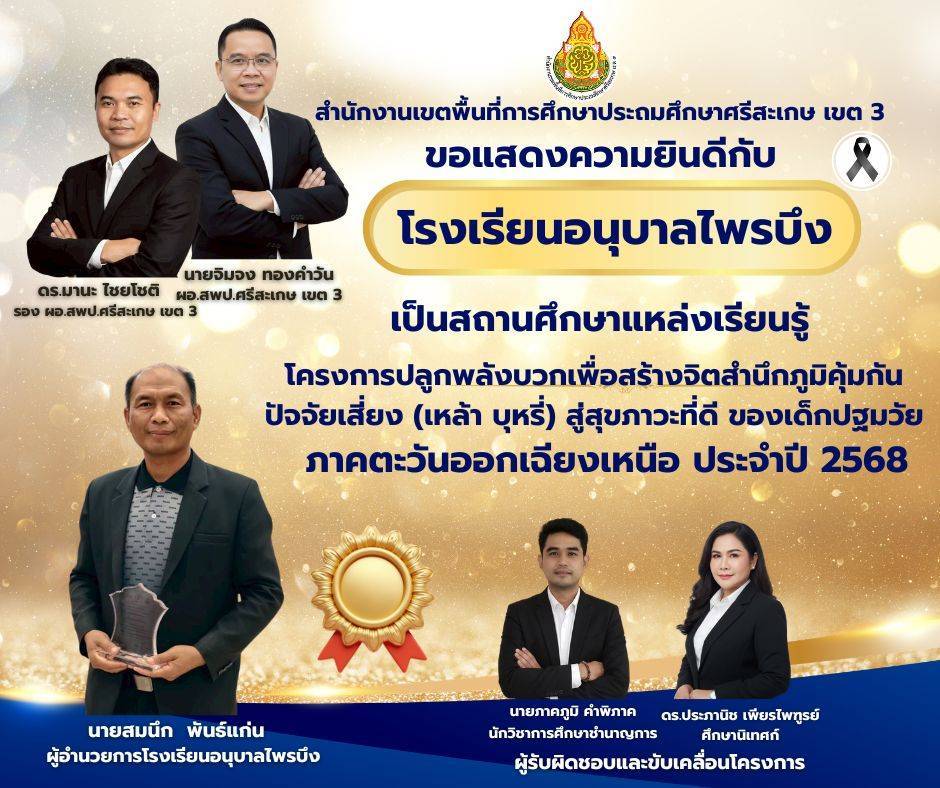 ขอแสดงความยินดีกับโรงเรียนอนุบาลไพรบึง เป็นสถานศึกษาต้นแบบ โครงการปลูกพลังบวกเพื่อสร้างจิตสำนึกภูมิคุ้มกันปัจจัยเสี่ยง(เหล้า บุหรี่)สู่สุขภาวะที่ดี ของเด็กปฐมวัย ภาคตะวันออกเฉียงเหนือ ประจำปี 2568 มีนาคม 12, 2026 Last updated : มีนาคม 12, 2026 wilailak chaiyamas