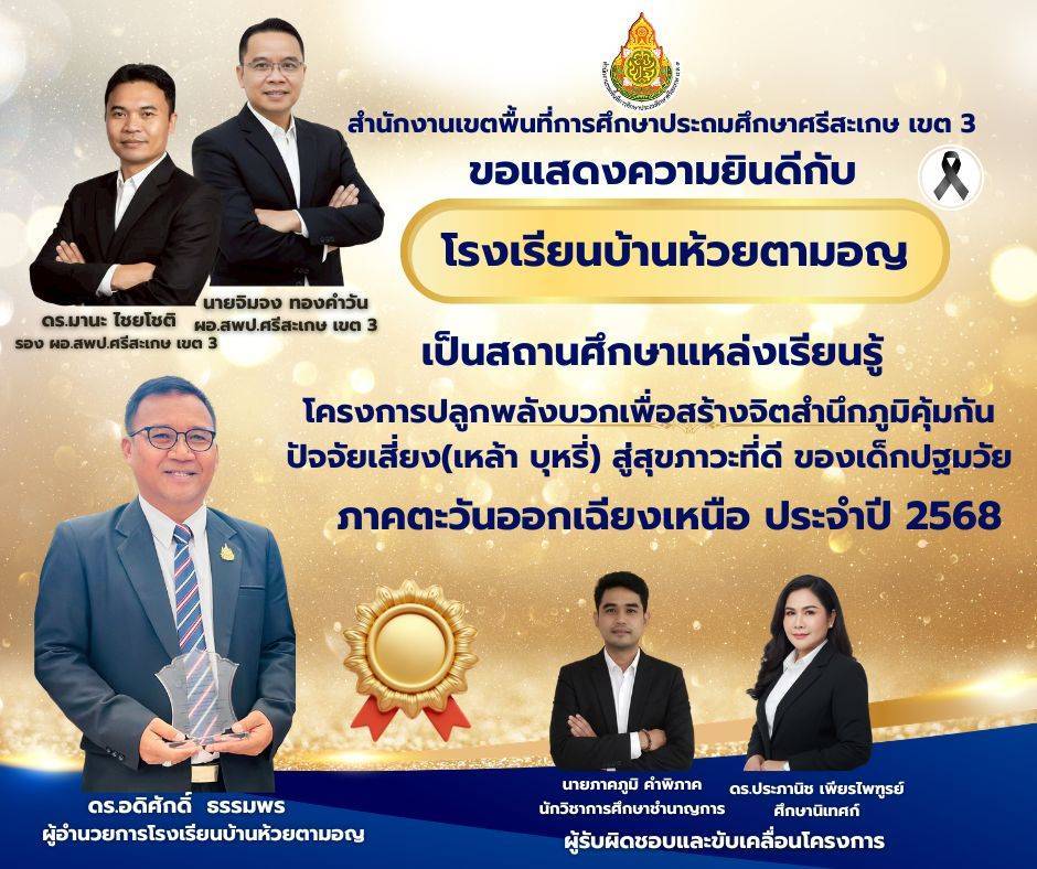 ขอแสดงความยินดีกับโรงเรียนบ้านห้วยตามอญ เป็นสถานศึกษาต้นแบบ โครงการปลูกพลังบวกเพื่อสร้างจิตสำนึกภูมิคุ้มกันปัจจัยเสี่ยง(เหล้า บุหรี่)สู่สุขภาวะที่ดี ของเด็กปฐมวัย ภาคตะวันออกเฉียงเหนือ ประจำปี 2568 มีนาคม 12, 2026 Last updated : มีนาคม 12, 2026 wilailak chaiyamas
