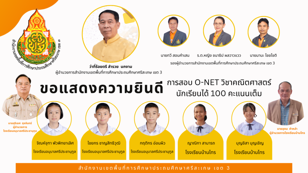 ขอแสดงความยินดี นักเรียนที่สอบ O-NET วิชาคณิตศาตร์ ได้คะแนน 100 คะแนนเต็ม