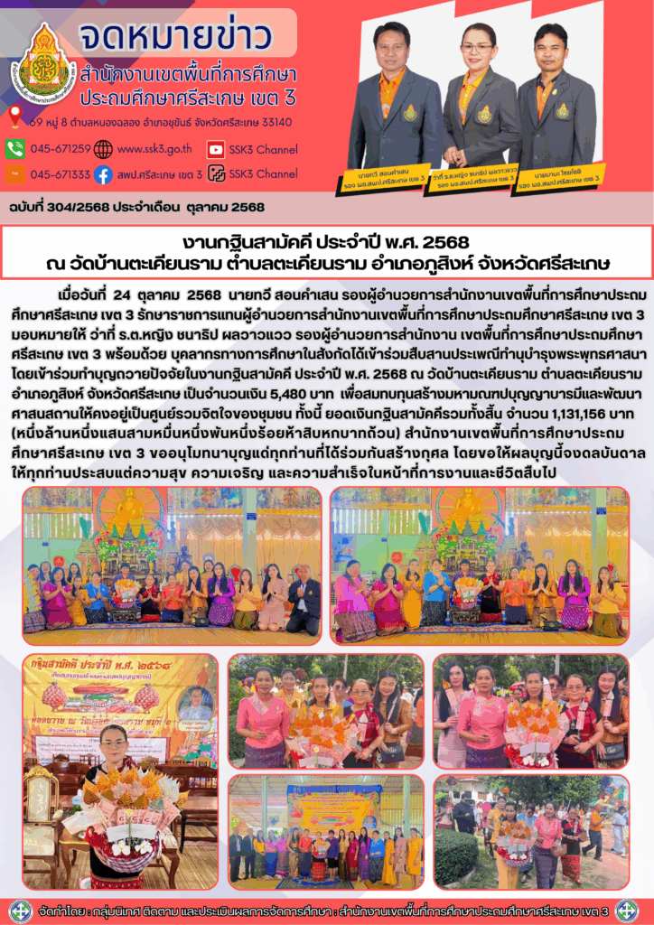 งานกฐินสามัคคี ประจำปี พ.ศ. 2568 ณ วัดบ้านตะเคียนราม ตำบลตะเคียนราม อำเภอภูสิงห์ จังหวัดศรีสะเกษ ตุลาคม 24, 2025 Last updated : ตุลาคม 24, 2025 Phakjerawan wayophat