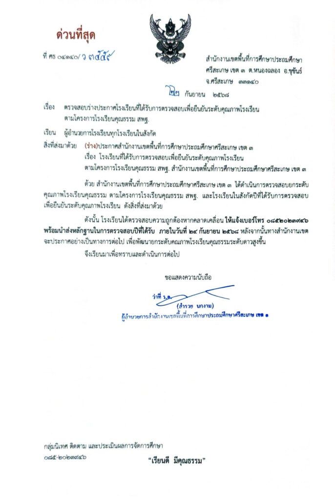 ตรวจสอบร่างประกาศโรงเรียนที่ได้รับการตรวจสอบเพื่อยืนยันระดับคุณภาพโรงเรียนตามโครงการโรงเรียนคุณธรรม สพฐ.