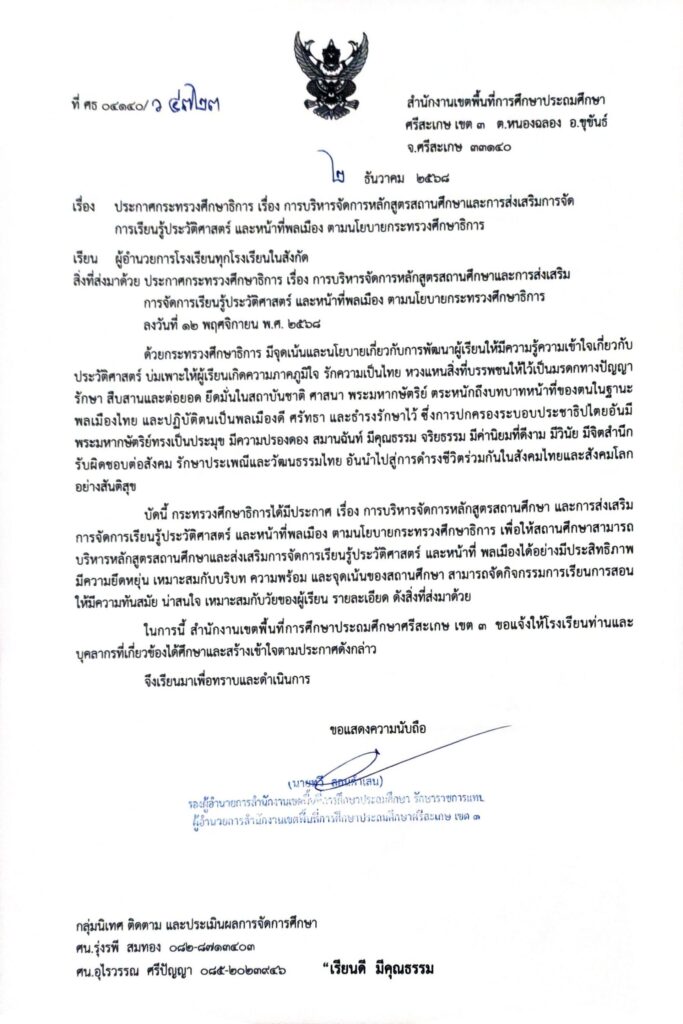 ประกาศกระทรวงศึกษาธิการ เรื่อง การบริหารจัดการหลักสูตรสถานศึกษาและการส่งเสริมการจัดการเรียนรู้ประวัติศาสตร์ และหน้าที่พลเมือง ตามนโยบายกระทรวงศึกษาธิการ