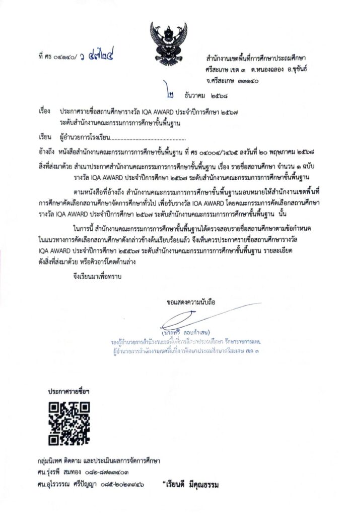 ประกาศรายชื่อสถานศึกษารางวัล IQA AWARD ประจำปีการศึกษา ๒๕๖๗ ระดับสำนักงานคณะกรรมการการศึกษาขั้นพื้นฐาน ธันวาคม 2, 2025 Last updated : ธันวาคม 2, 2025 Phakjerawan wayophat คลิกหนังสือที่ ว4724