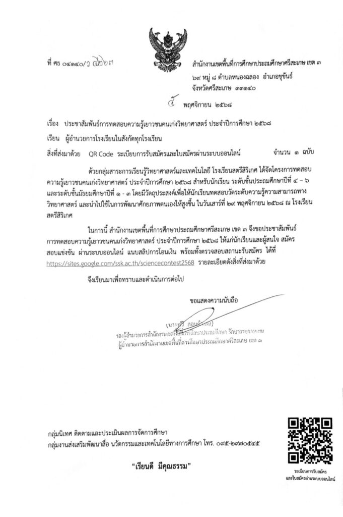 ประชาสัมพันธ์การทดสอบความรู้เยาวชนคนเก่งวิทยาศาสตร์ ประจำปีการศึกษา 2568 พฤศจิกายน 5, 2025 Last updated : พฤศจิกายน 5, 2025 Phakjerawan wayophat