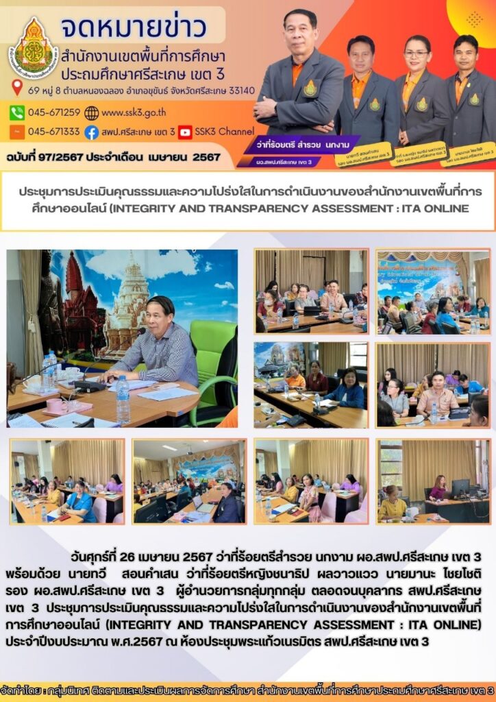ประชุมการประเมินคุณธรรมและความโปร่งใสในการดำเนินงานของสำนักงานเขตพื้นที่การศึกษาออนไลน์ (INTEGRITY AND TRANSPARENCY ASSESSMENT : ITA ONLINE พฤษภาคม 8, 2024 Last updated : พฤษภาคม 8, 2024 Phakjerawan wayophat