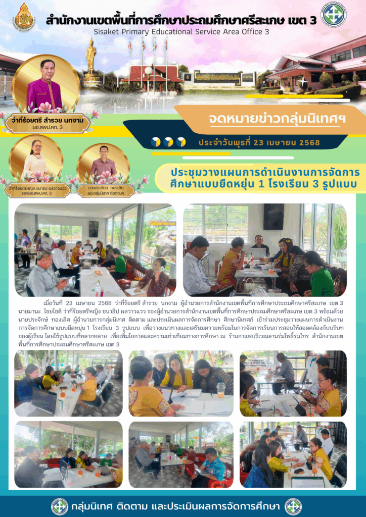เมื่อวันที่ 23 เมษายน 2568 ว่าที่ร้อยตรี สำรวย นกงาม ผู้อำนวยการสำนักงานเขตพื้นที่การศึกษาประถมศึกษาศรีสะเกษ เขต 3 นายมานะ ไชยโชติ ว่าที่ร้อยตรีหญิง ชนาธิป ผลวาวแวว รองผู้อำนวยการสำนักงานเขตพื้นที่การศึกษาประถมศึกษาศรีสะเกษ เขต 3 พร้อมด้วย นายประจักษ์ ทองเลิศ ผู้อำนวยการกลุ่มนิเทศ ติดตาม และประเมินผลการจัดการศึกษา ศึกษานิเทศก์ เข้าร่วมประชุมวางแผนการดำเนินงาน การจัดการศึกษาแบบยืดหยุ่น 1 โรงเรียน 3 รูปแบบ เพื่อวางแนวทางและเตรียมความพร้อมในการจัดการเรียนการสอนให้สอดคล้องกับบริบท ของผู้เรียน โดยใช้รูปแบบที่หลากหลาย เพื่อเพิ่มโอกาสและความเท่าเทียมทางการศึกษา ณ ร้านกาแฟบริเวณลานร่มโพธิ์ร่มไทร สำนักงานเขตพื้นที่การศึกษาประถมศึกษาศรีสะเกษ เขต 3