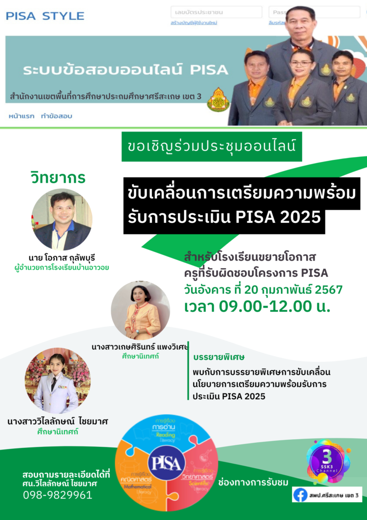 เพื่อขับเคลื่อนการเตรียมความพร้อมรับการประเมิน PISA 2025 วันอังคาร ที่ 20 กุมภาพันธ์ 2567 ผ่านระบบออนไลน์ ทางสถานีทีวีดิจิทัล SSK3 CHANNEL และ FACEBOOK SSK3