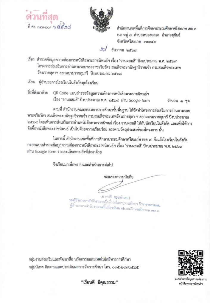 เรื่อง สำรวจข้อมูลความต้องการหนังสือพระราชนิพนธ์ฯ เรื่อง "จานผสมสี" ปีงบประมาณ พ.ศ. 2568 ธันวาคม 18, 2025 Last updated : ธันวาคม 18, 2025 Phakjerawan wayophat