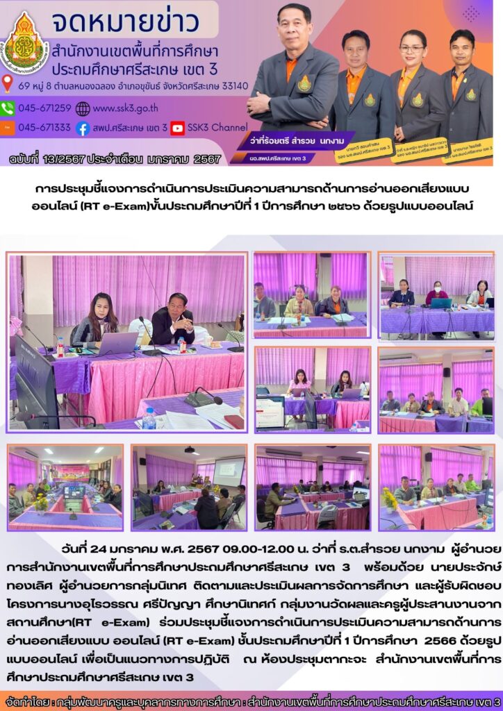 วันที่ 24 มกราคม พ.ศ. 2567 09.00-12.00 น. ว่าที่ ร.ต.สำรวย นกงาม ผู้อำนวยการสำนักงานเขตพื้นที่การศึกษาประมศึกษาศรีสะเกษ เขต 3 พร้อมด้วย นายประจักษ์ทองเลิศ ผู้อำนวยการกลุ่มนิเทศ ติดตามและประเมินผลการจัดการศึกษา และผู้รับผิดชอบโครงการนางอุโรวรรณ ศรีปัญญา ศึกษานิเทศก์ กลุ่มงานวัดผลและครูผู้ประสานงานจากสถานศึกษา(RT -Exam) ร่วมประชุมชี้แจงการดำเนินการประเมินความสามารถด้านการอ่านออกเสียงแบบ ออนไลน์ (RT e-Exam) ชั้นประถมศึกษาปีที่ 1 ปีการศึกษา 2566 ด้วยรูปแบบออนไลน์ เพื่อเป็นแนวทางการปฏิบัติ ณ ห้องประชุมตากะจะ สำนักงานเขตพื้นที่การศึกษาประถมศึกษาศรีสะเกษ เขต 3
